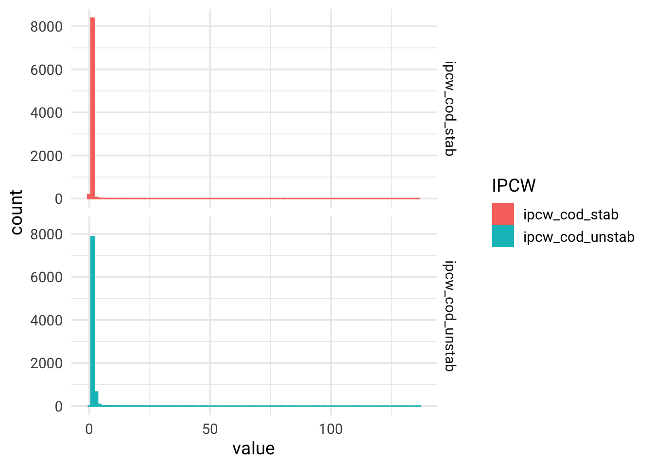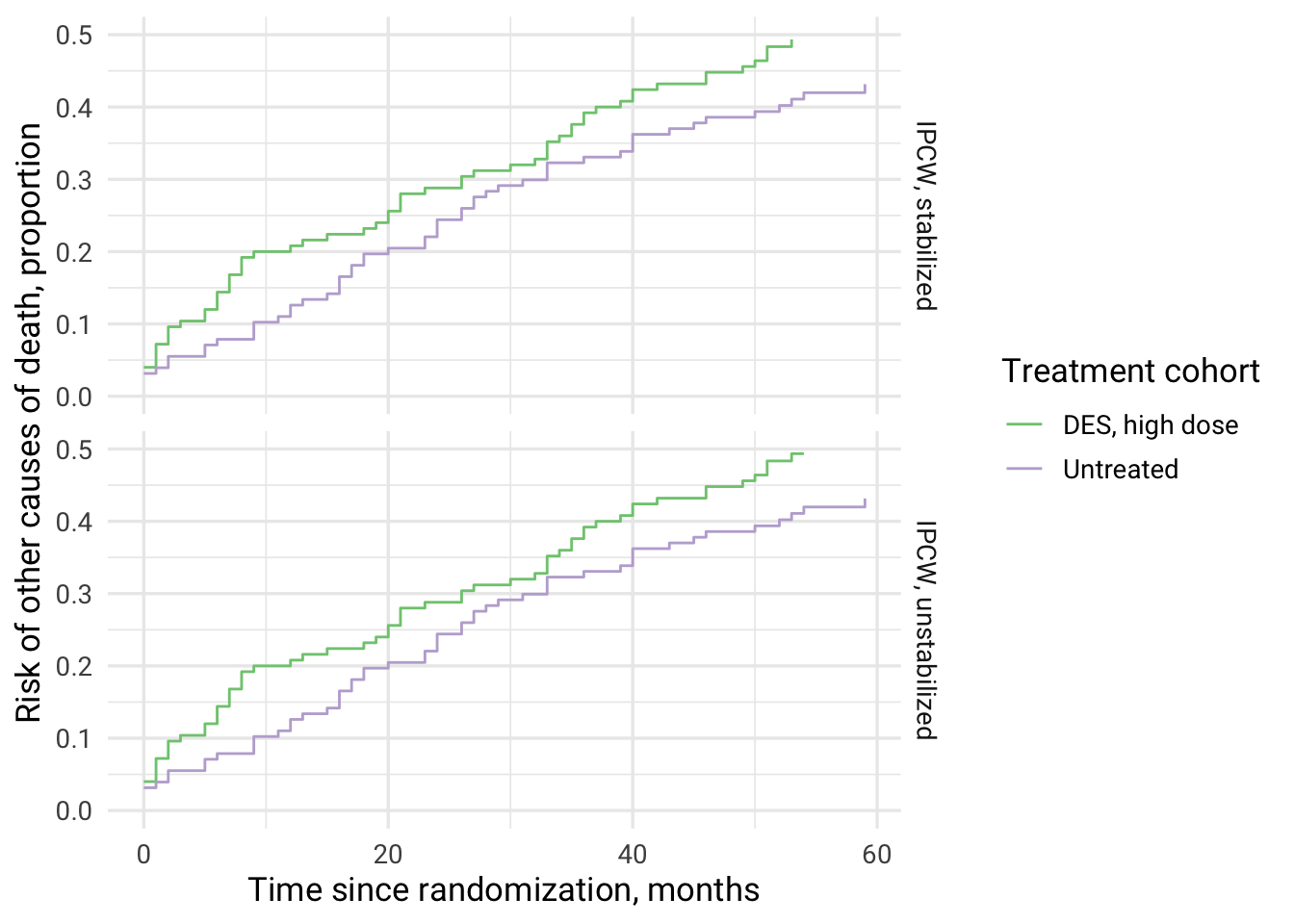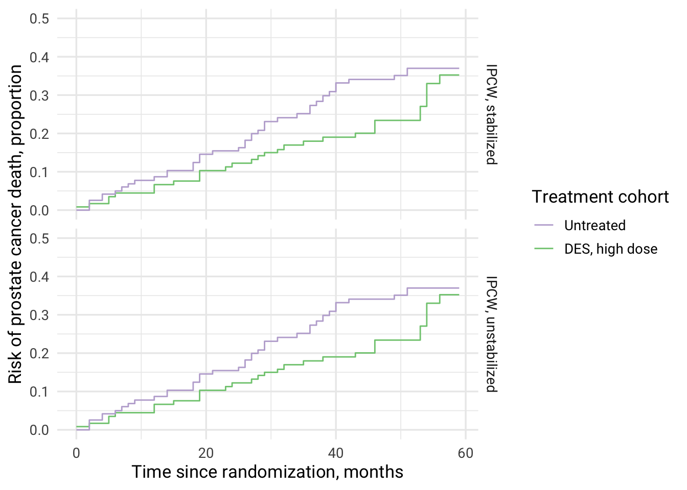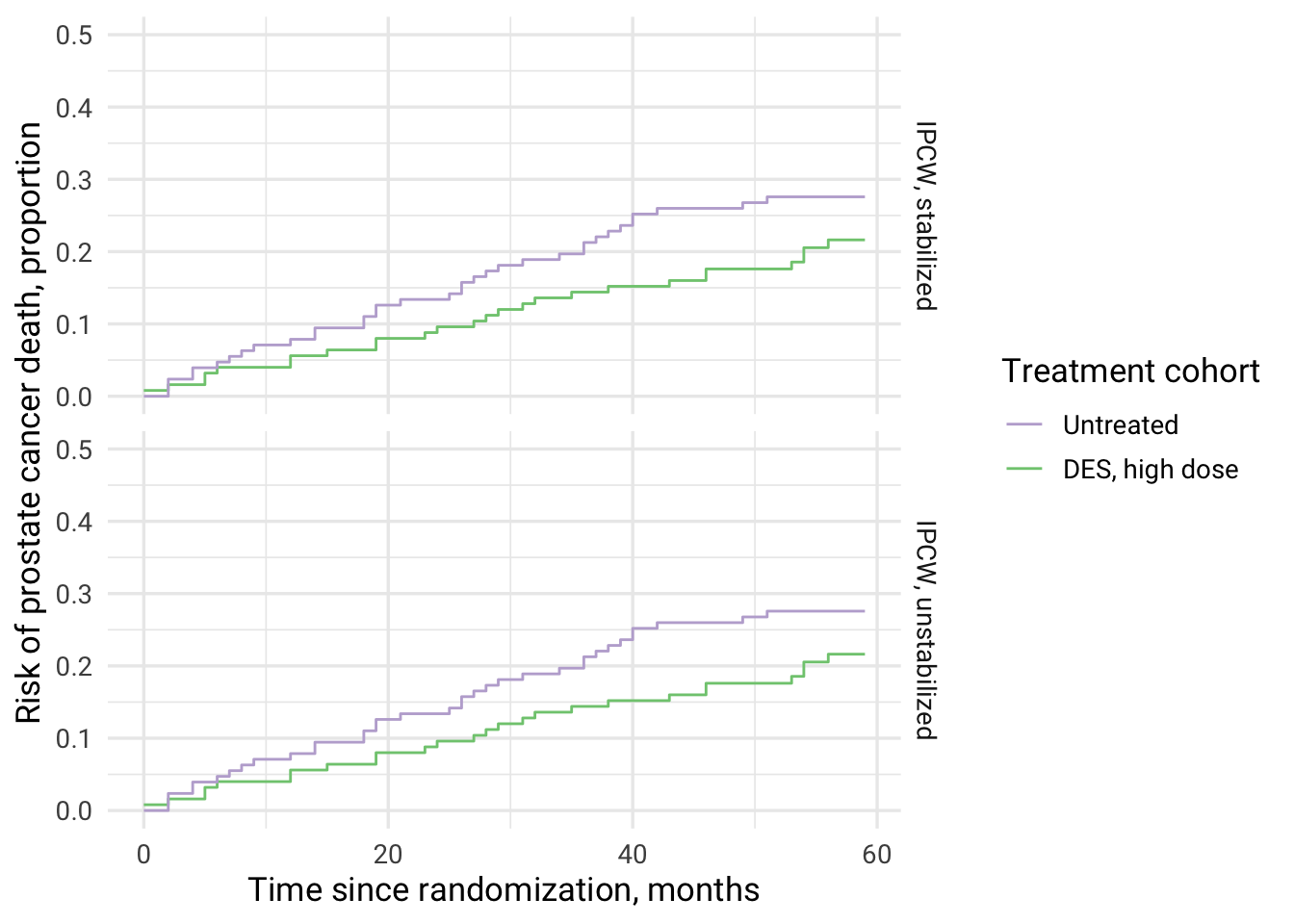 - Unstabilized and stabilized IPC weights performed virtually identical in this example of prostate cancer death data from Byar & Greene’s DES treatment RCT.