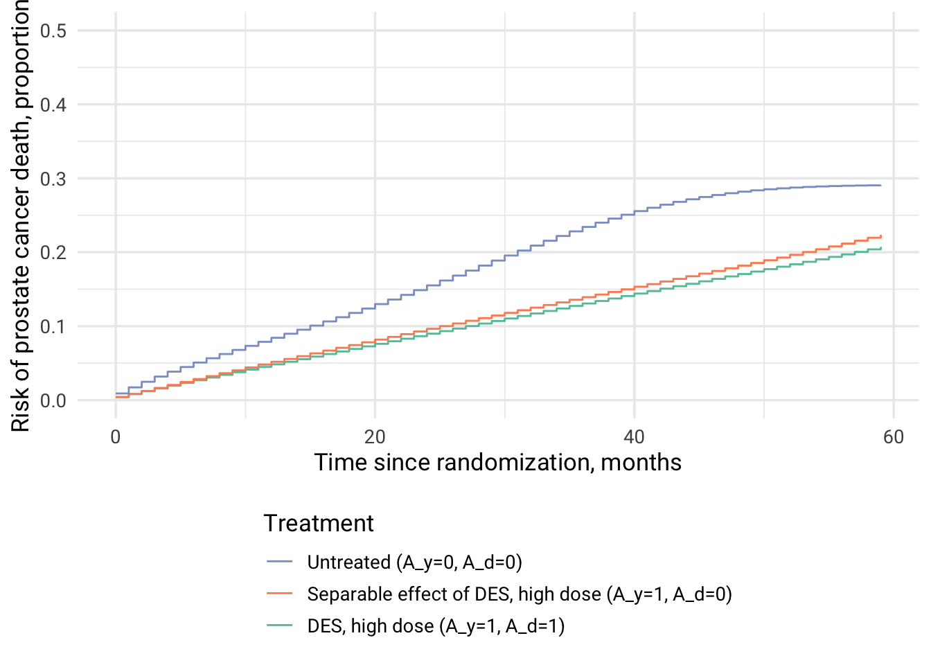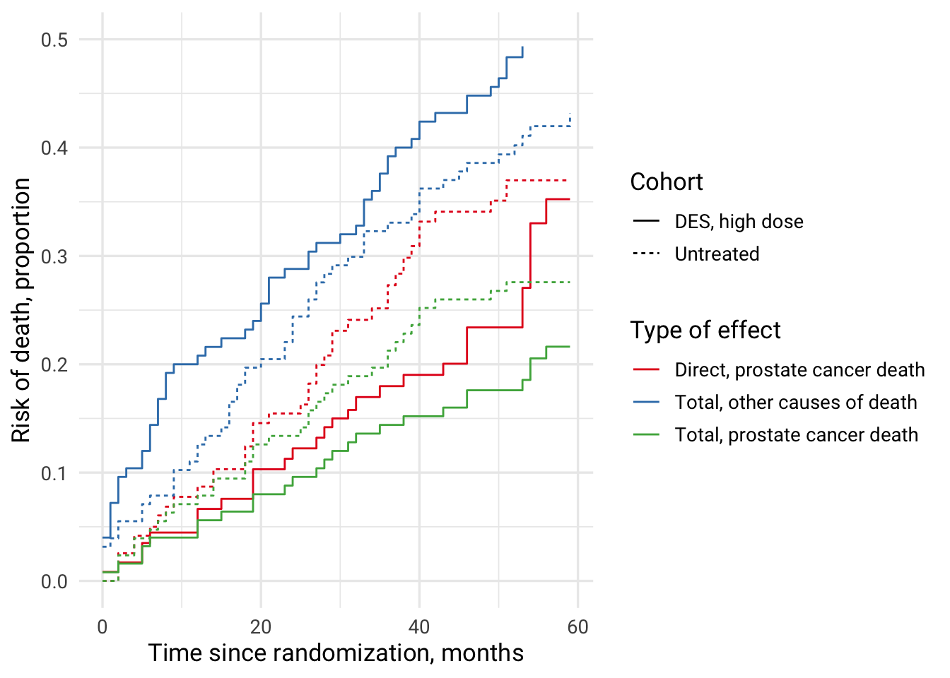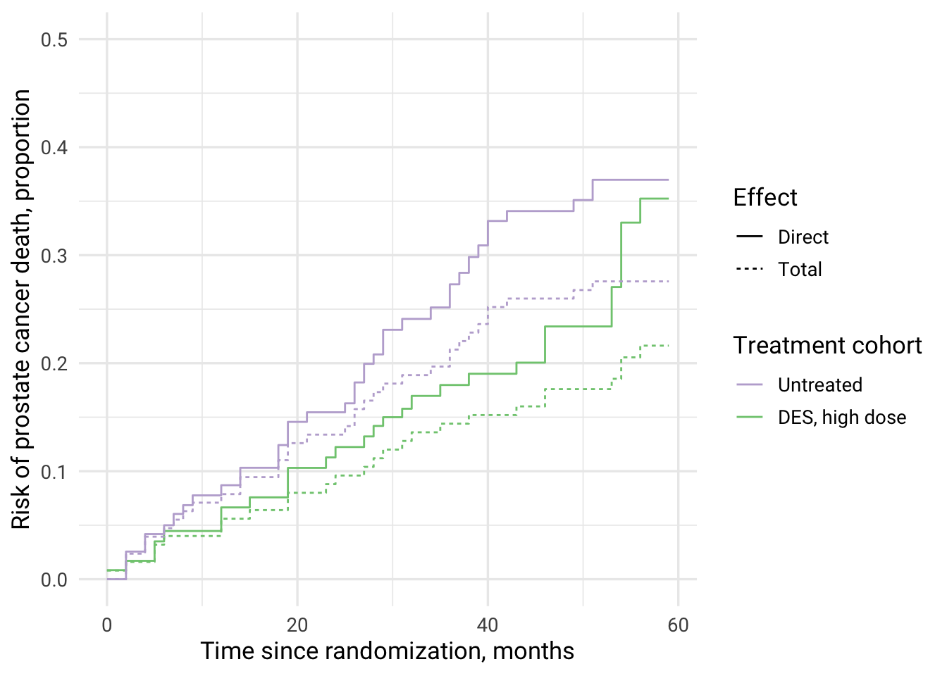 Previously, DES treatment vs no treatment showed reduced mortality when the direct effect on prostate cancer death was investigated, but mortality from other causes in DES cohort was increased. The interpretation of total effect of DES on prostate cancer mortality was difficult. Possible interpretation 1: prostate cancer mortality was reduced due to DES treatment and this population could die from other causes, which appeared as increased risk of death from other causes. Scenario 2: DES treatment increased mortality due to other causes and so, by being a competing event, prevented this population from dying due to prostate cancer leading to the appearance of a protective effect of DES.