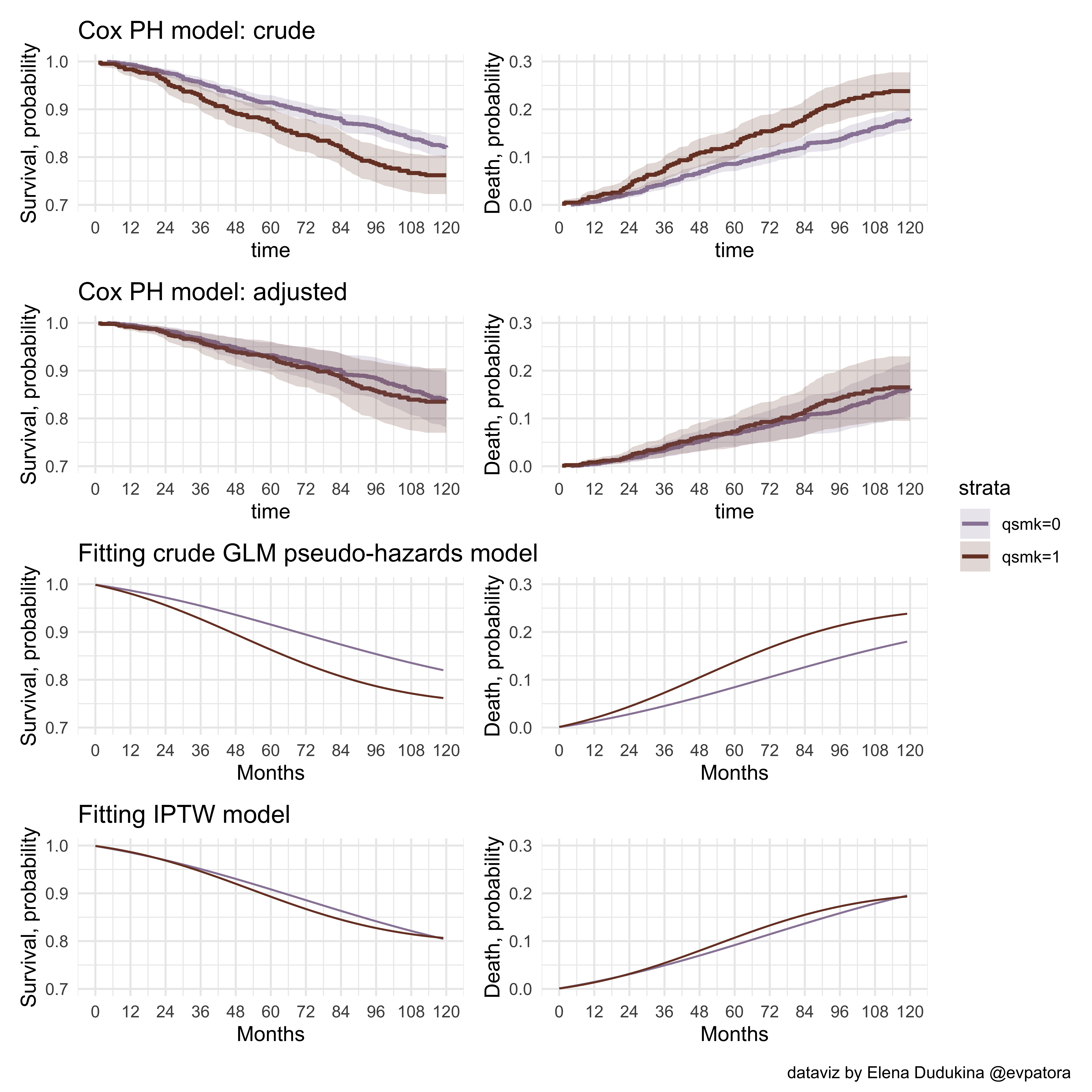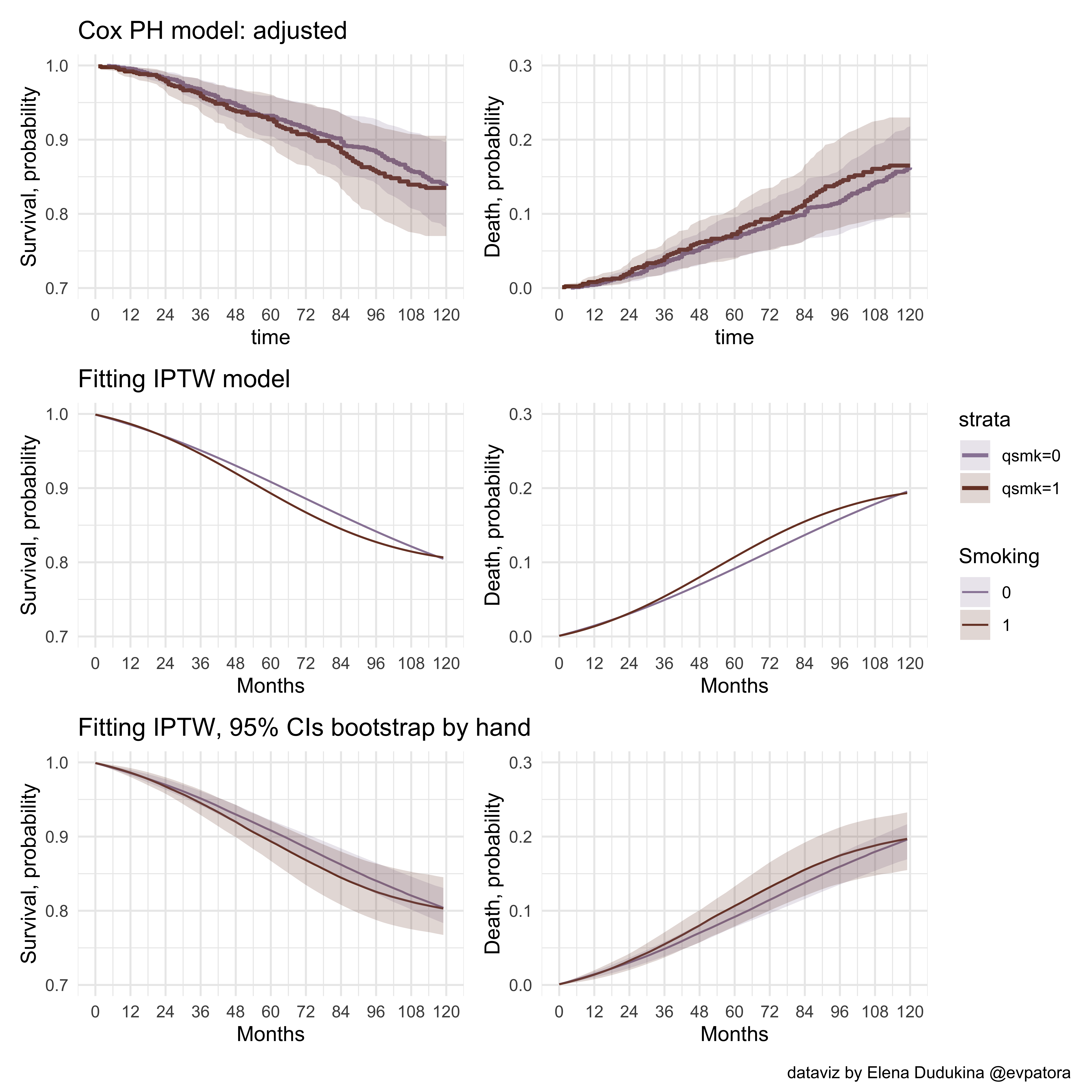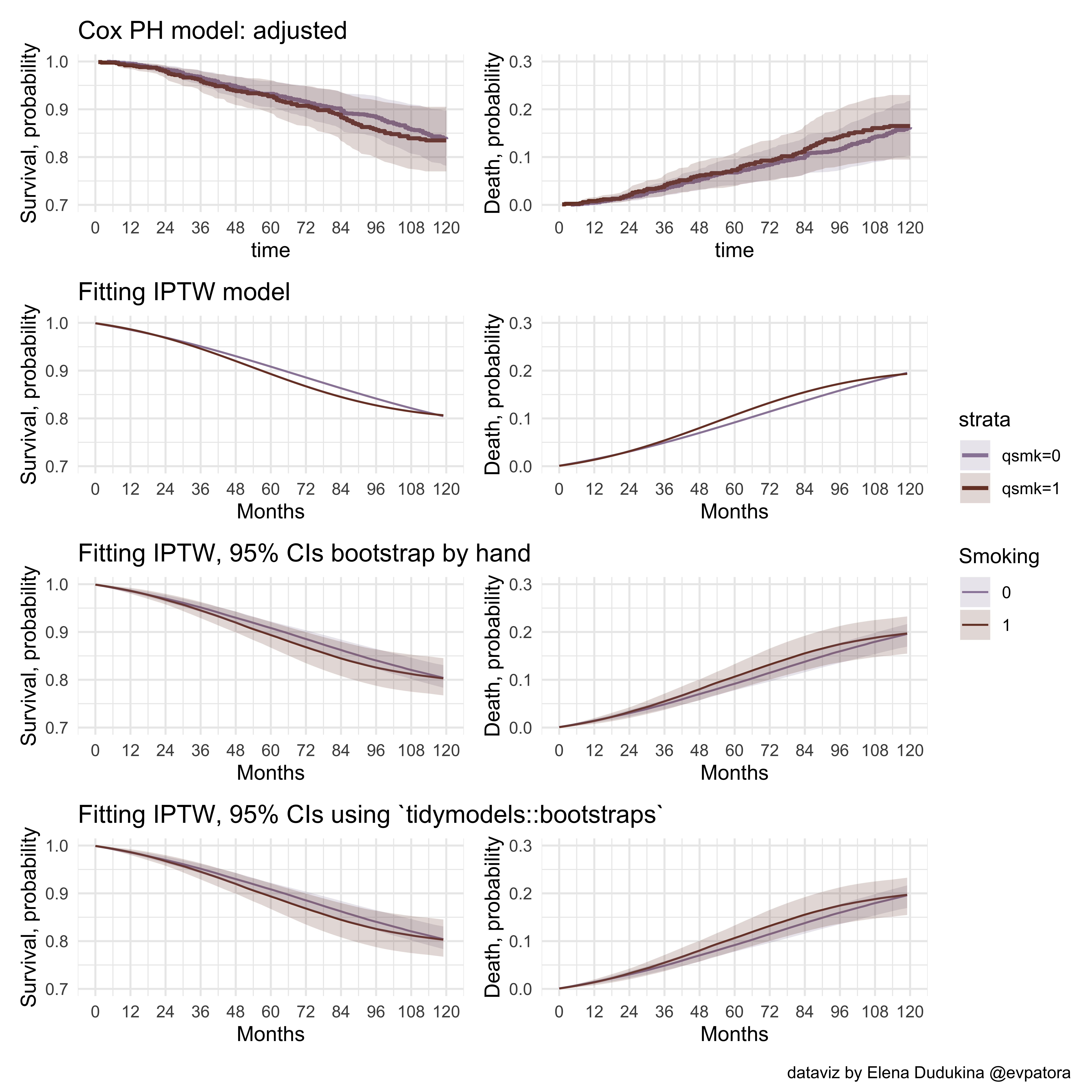 In this post, I have a look inside the Chapter 17 on Causal Survival Analysis of the “Causal Inference: What If” book by M. Hernan and J. Robins. I explore IPTW fitting following the chapter’s narrative and use the machinery of the tidyverse throughout. I utilize the script I’ve initially written in 2018. The code is not spectacularly efficient or pretty, but I deliberately did not change it π There are plenty of useful open source materials for “Causal Inference: What If” book, which can be found on the