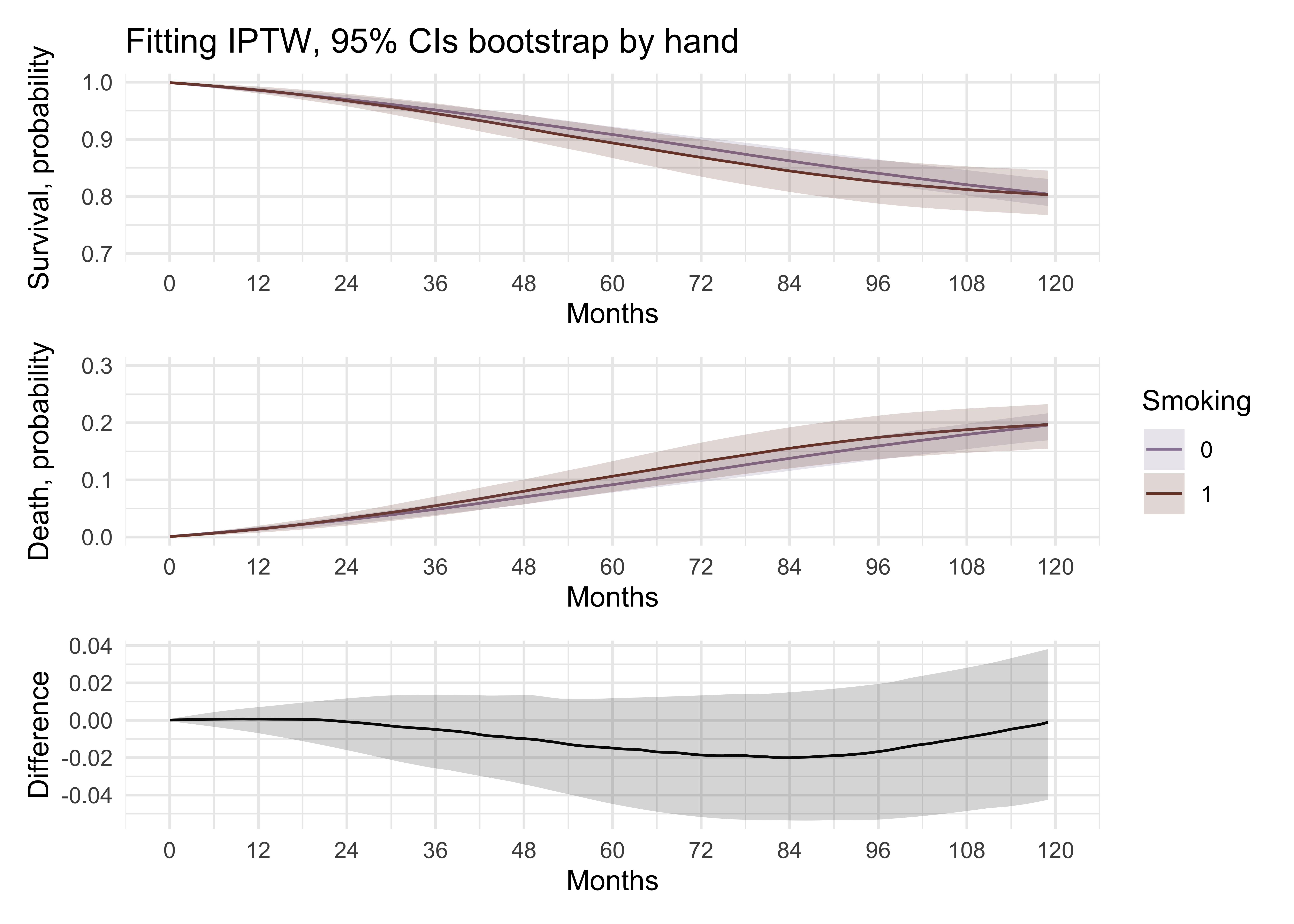 ggtitle("Fitting IPTW, 95% CIs bootstrap by hand") +