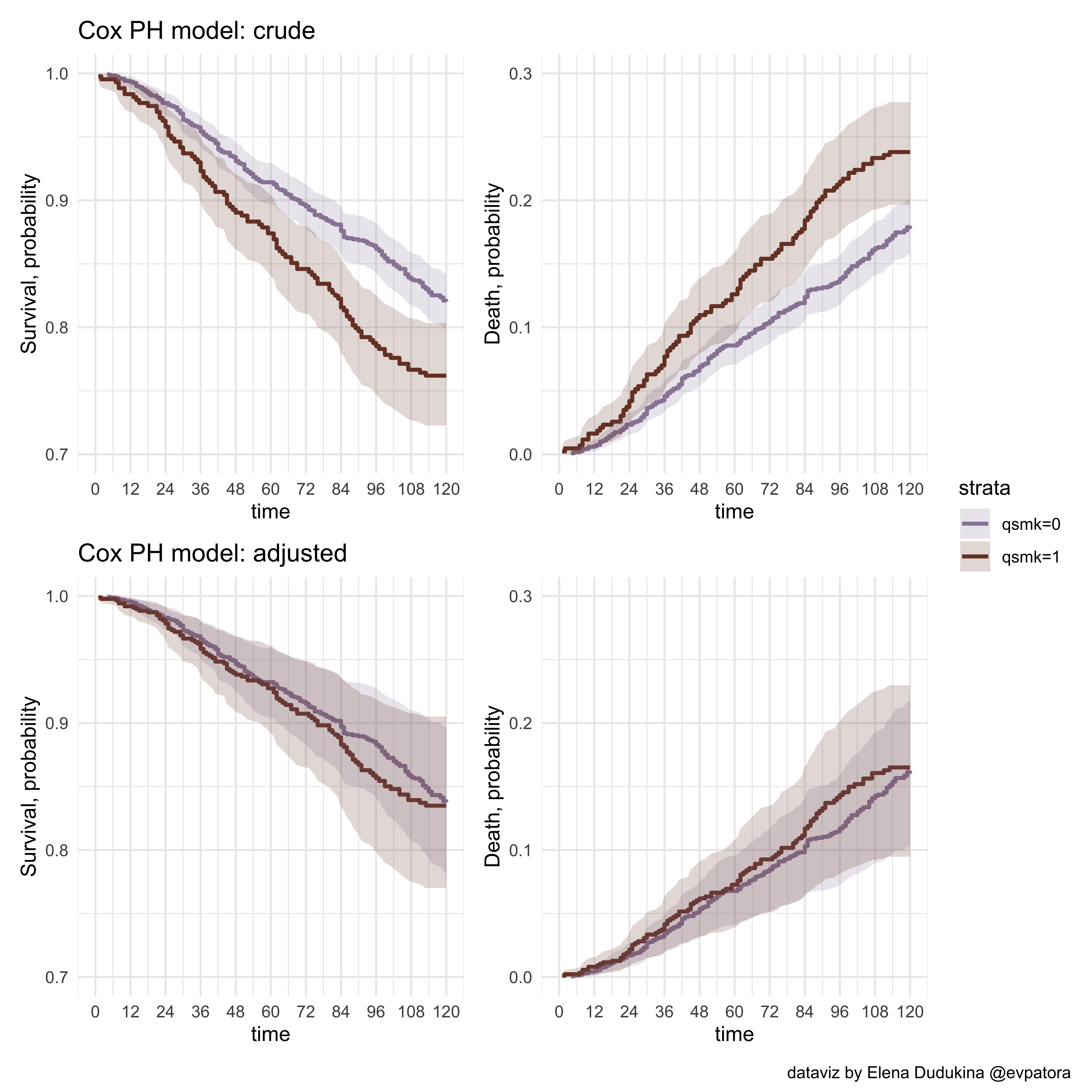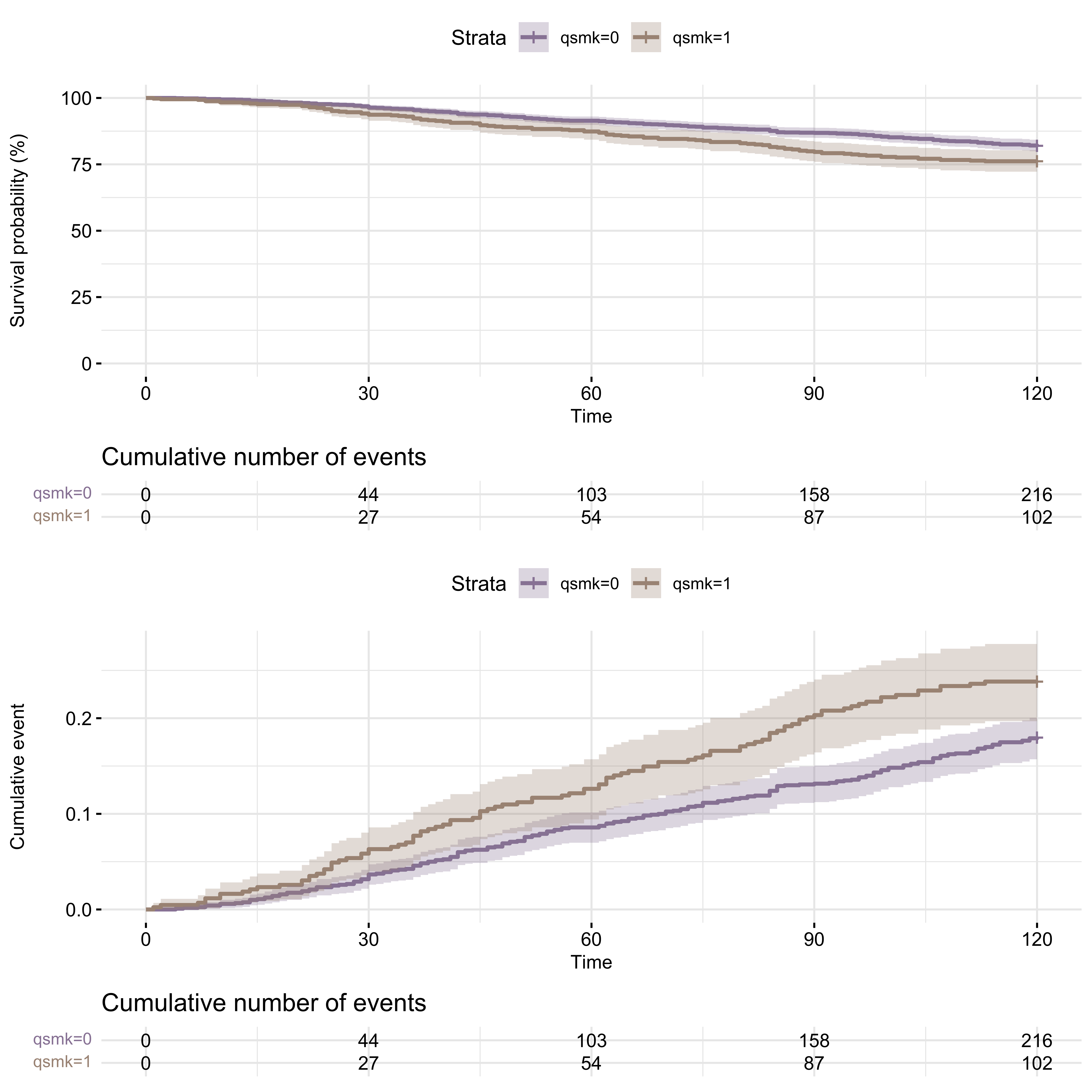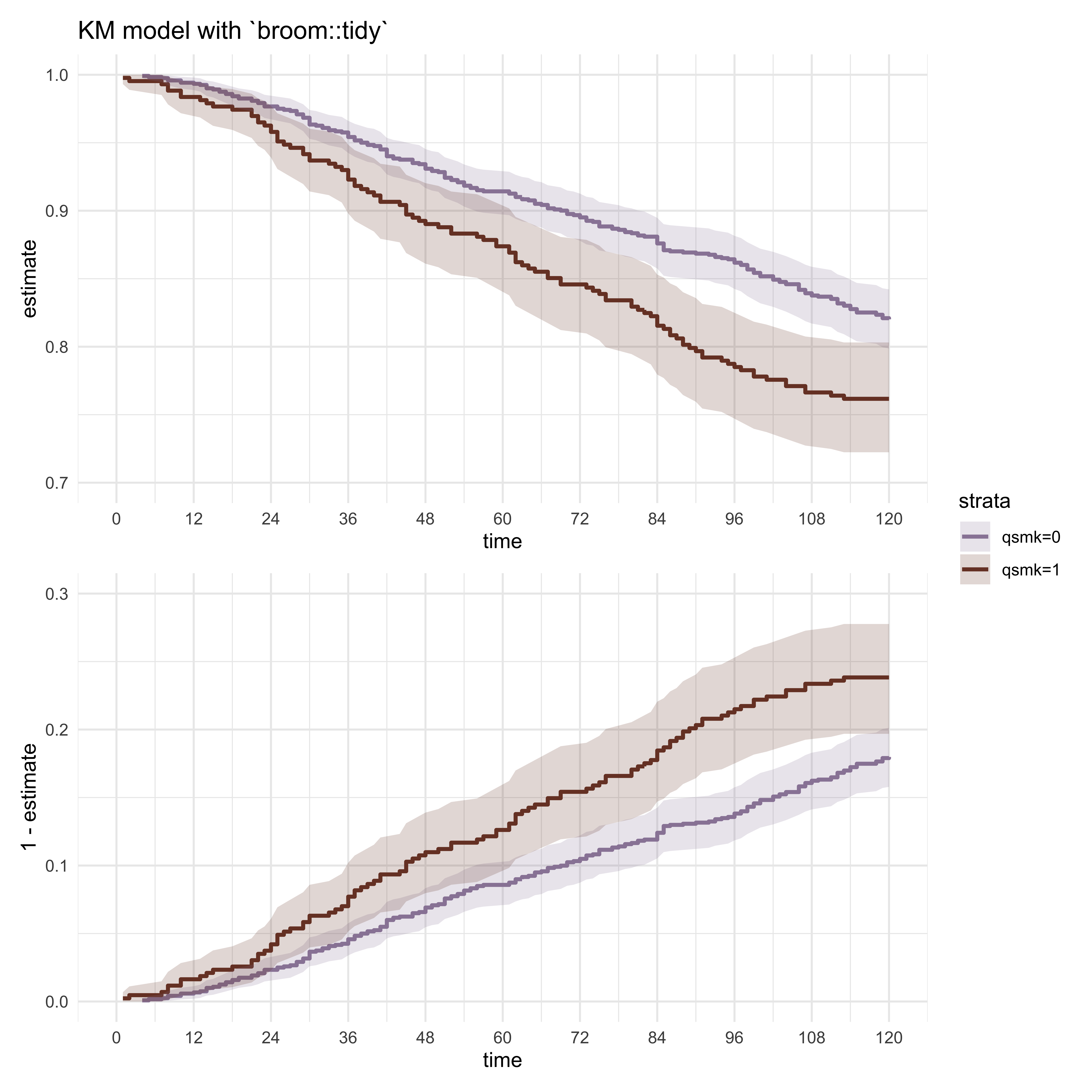 ggplot(aes(x = time, y = 1 - Q50, color = factor(qsmk), fill = factor(qsmk))) +