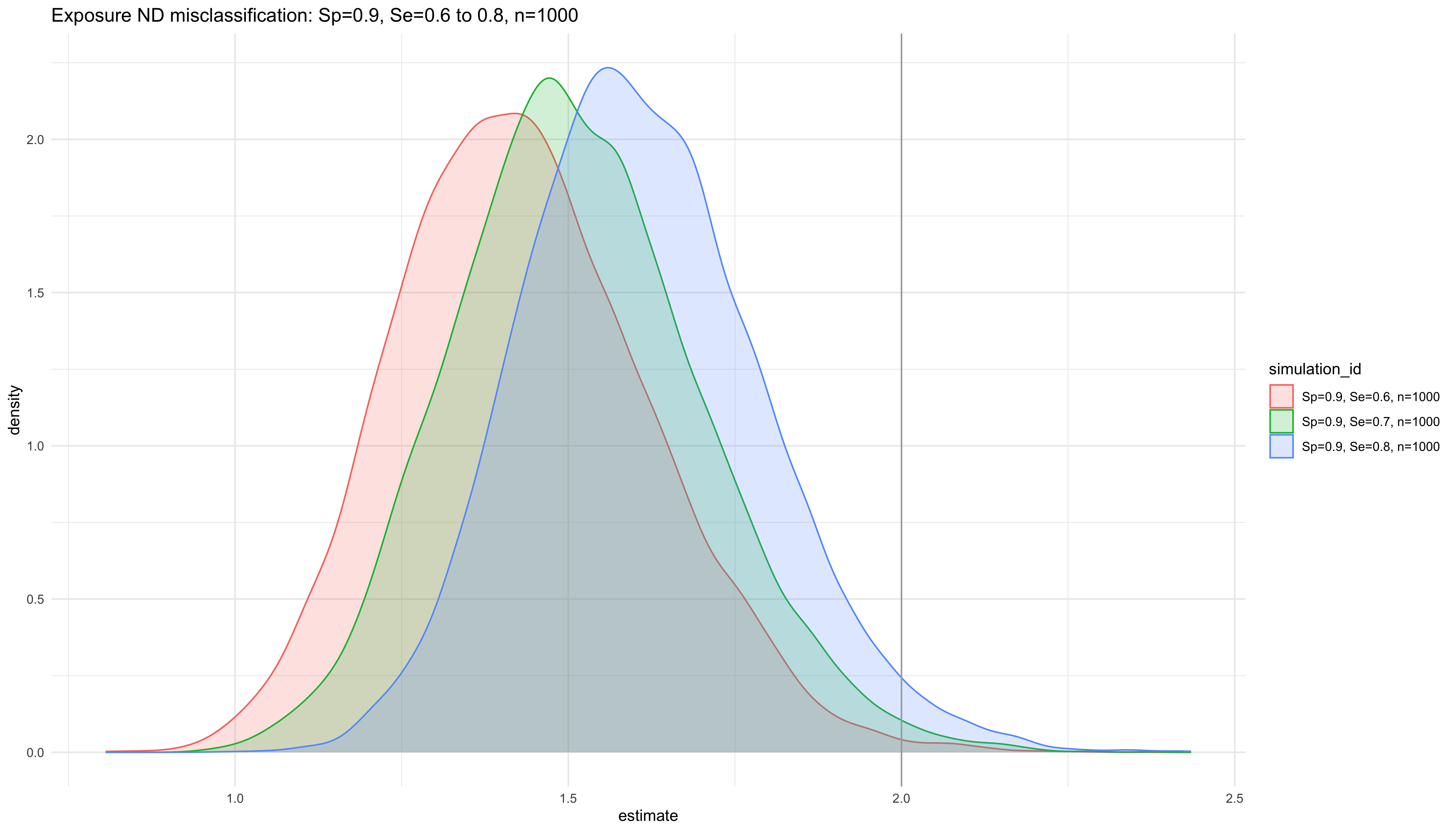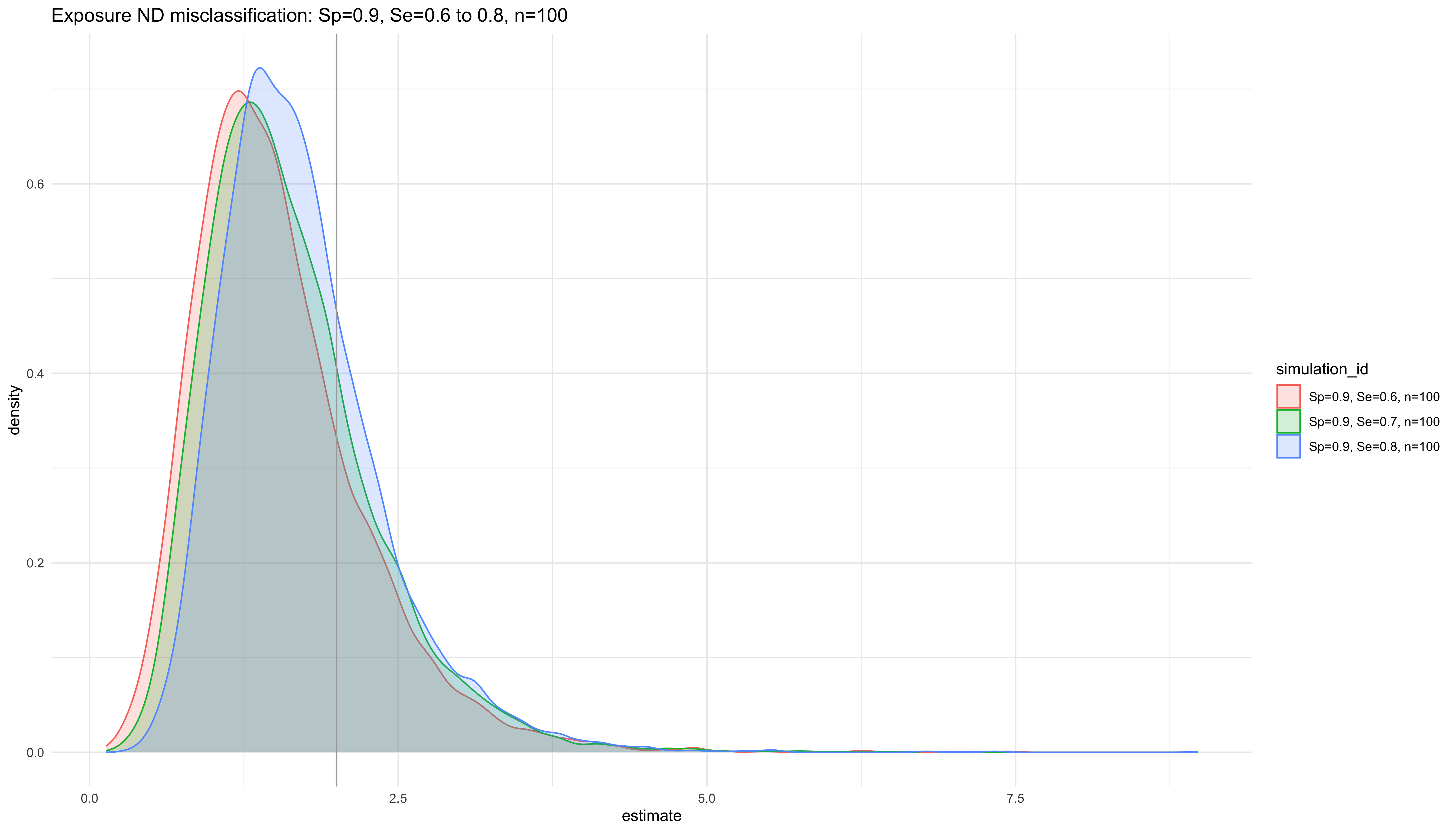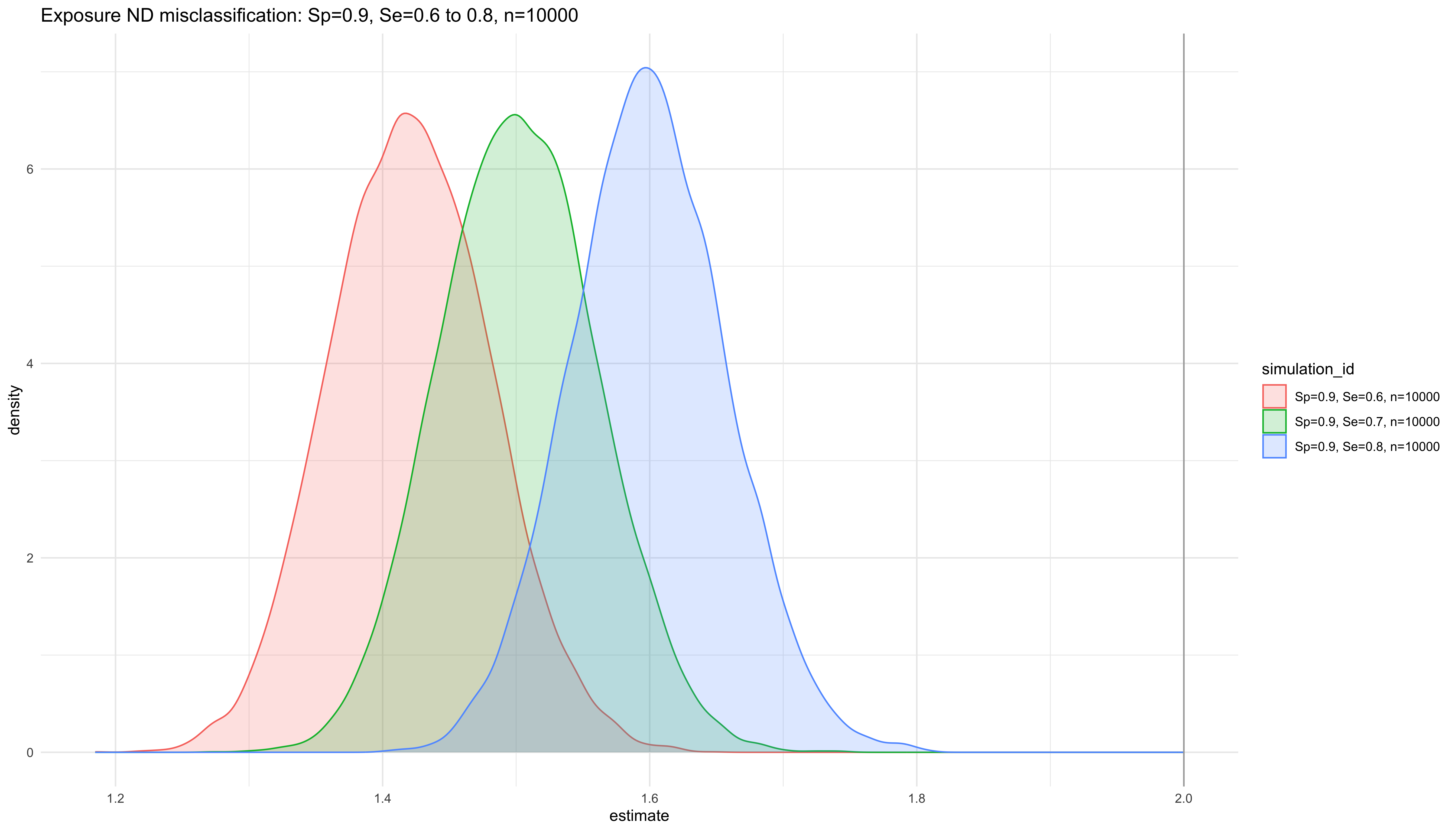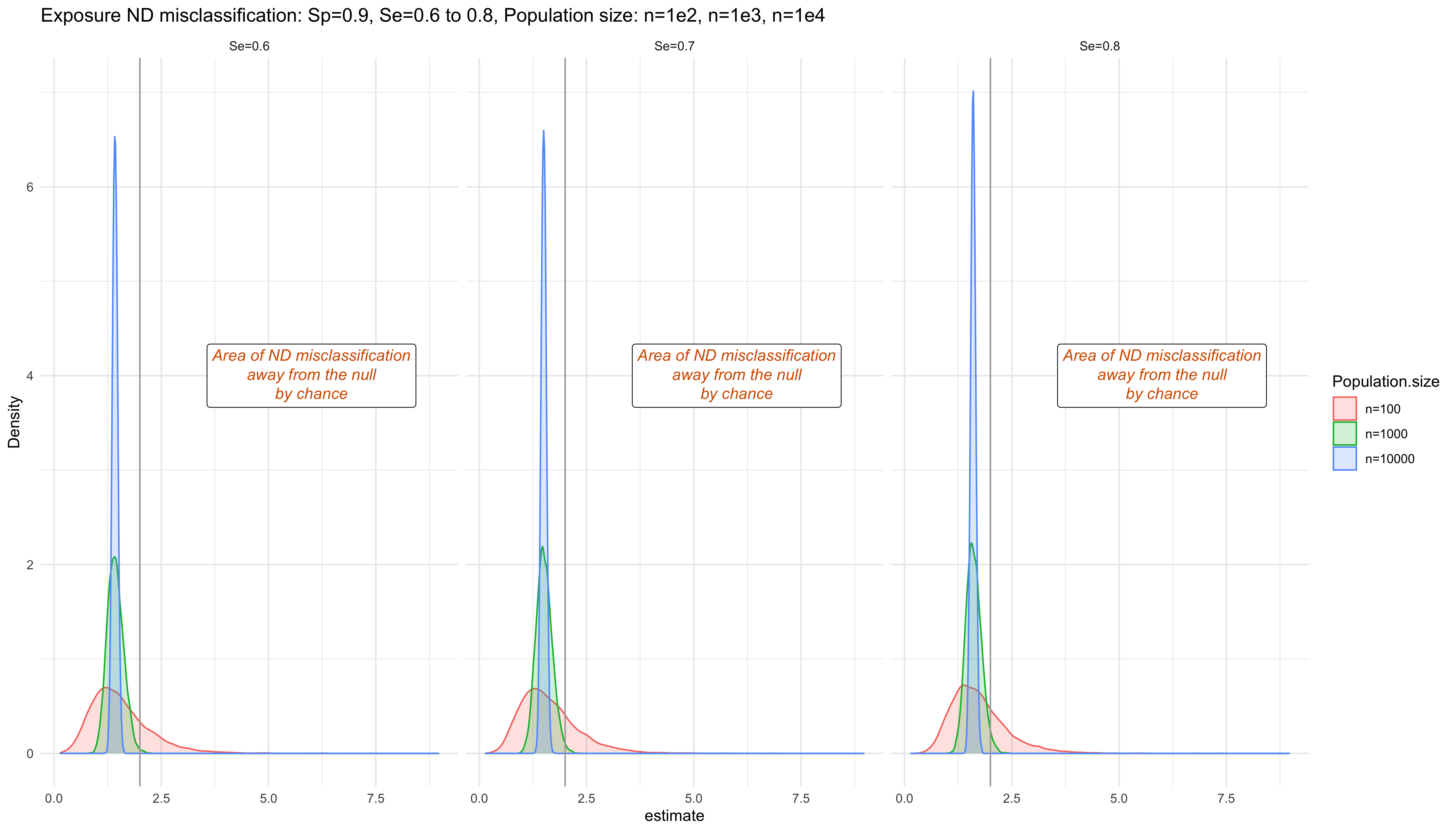 labs(title = "Exposure ND misclassification: Sp=0.9, Se=0.6 to 0.8, Population size: n=1e2, n=1e3, n=1e4", x="Density") +