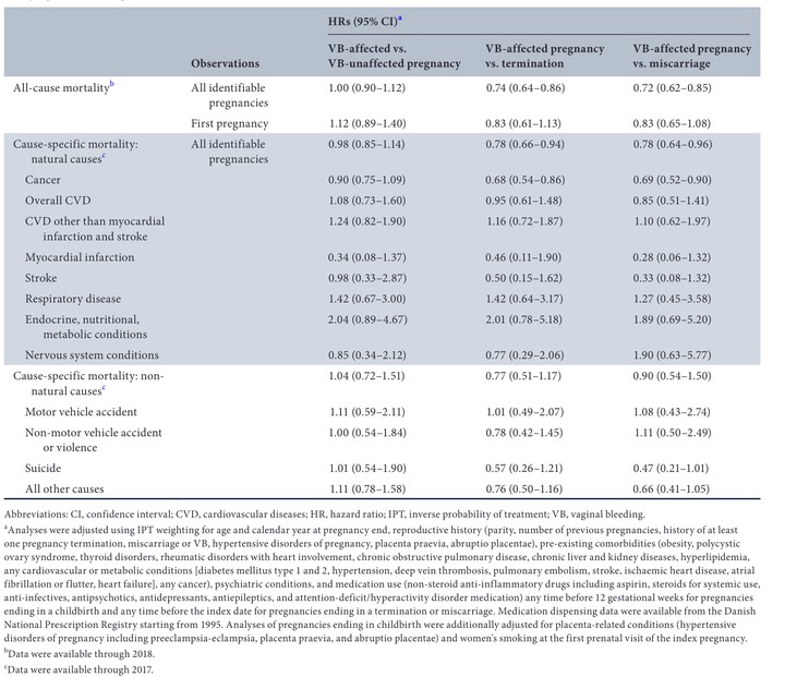 We aimed to investigate the association between vaginal bleeding (VB) in pregnancy and women’s mortality, using VB-unaffected pregnancies, terminations and miscarriages as comparators. This was an observational cohort study using nationwide registries of Denmark linked at an individual level. Population or Sample 1 354 181 women and their 3 162 317 pregnancies (1979–2017), including 70 835 VB-affected pregnancies and comparators, i.e. 2 236 359 VB-unaffected pregnancies ending in childbirth, 589 697 terminations, and 265 426 miscarriages. We followed pregnancies until the earliest date of woman’s death, emigration or end of data. Main outcome measures All-cause and cause-specific mortality rates per 10 000 person-years (PY) and hazard ratios (HRs) with 95% confidence intervals (CIs) adjusted using Cox proportional hazards regression for age, calendar year, pre-existing chronic conditions and socio-economic factors. Results There were 2320 deaths from any cause among women following VB-affected pregnancy (mortality rate 15.2, 95% CI 14.6–15.9 per 10 000 PY), 55 030 deaths following VB-unaffected pregnancy (mortality rate 12.7, 95% CI 12.6–12.8), 27 500 deaths following a termination (mortality rate 21.9, 95% CI 21.6–22.1), and 10 865 deaths following a miscarriage (mortality rate 19.2, 95% CI 18.8–19.6). For comparison of VB-affected versus VB-unaffected pregnancies, associations with all-cause (HR 1.14, 95% CI 1.09–1.19), natural causes (HR 1.15, 95% CI 1.09–1.22) and non-natural causes (HR 1.27, 95% CI 1.08–1.48) mortality were attenuated in a sensitivity analysis of pregnancies recorded in 1994–2017 (HR 1.00, 95% CI 0.90–1.12, HR 0.98, 95% CI 0.85–1.14 and HR 1.04, 95% CI 0.72–1.51, respectively). Contrasts with remaining comparators did not suggest increased risks of all-cause, natural or non-natural mortality causes. Conclusion - We found no evidence of an increased risk of women’s mortality following VB-affected versus VB-unaffected pregnancy, termination or miscarriage.